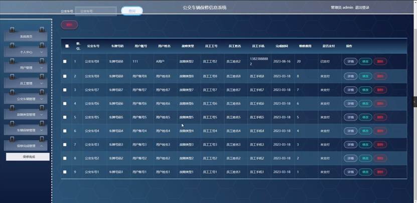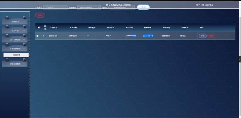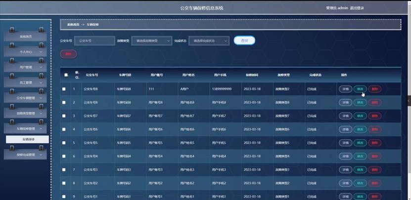 管理员点击车辆保修管理。在车辆保修页面输入公交车号、选择故障类型和选择完成状态进行查询或删除车辆保修列表,并根据需要对车辆保修详情信息进行详情、修改或删除操作;如图5-7所示: