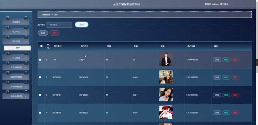 管理员点击用户管理。在用户页面输入用户账号进行查询、新增或删除用户列表,并根据需要对用户详情信息进行详情、修改或删除操作;如图5-3所示: