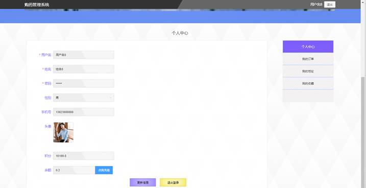点击个人中心,用户在个人中心页面可以更新个人信息、退出登录、充值余额,还可以对我的订单、我的地址和我的收藏内容进行详细操作;具体操作页面如下图所示: