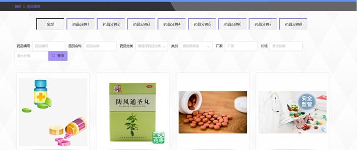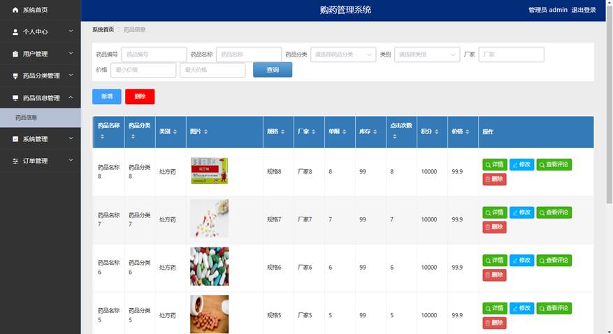 管理员点击药品信息管理,进入药品信息管理页面,通过输入药品编号、药品名称、药品分类、类别、厂家、价格(最小价格、最大价格)可以查询的操作,还能对药品信息进行新增、查看详情、修改、查看评论或删除等操作。具体操作如下图所示:
