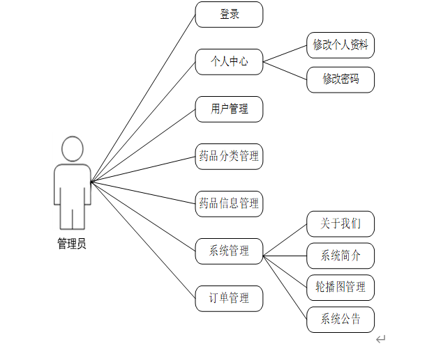 (2)、管理员的功能是最高的,可以对系统所有功能进行管理,包括对个人中心、用户管理、药品分类管理、药品信息管理、系统管理、订单管理的管理。管理员用例如下: