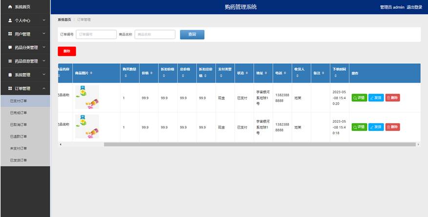 管理员点击订单管理,进入订单管理页面,可以对已支付订单、已完成订单、已取消订单、已退款订单、未支付订单、已发货订单等订单进行管理;在已支付订单页面,管理员可以通过输入订单编号和商品名称进行查询的操作,还可以进行查看详情、在线发货或删除的操作。具体操作页面如图5-13所示: