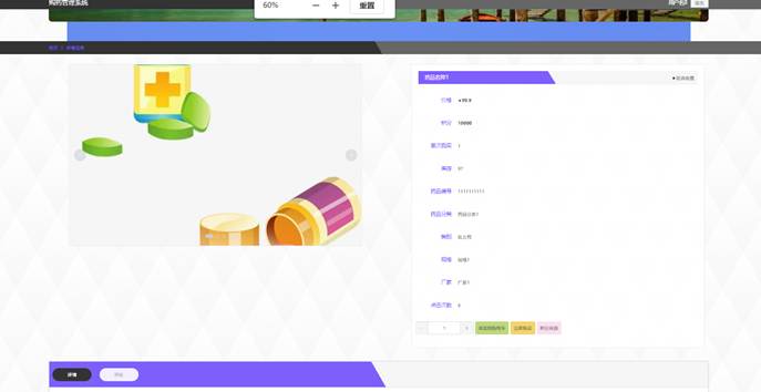 在药品信息页面的输入栏中输入药品编号、药品名称、药品分类、类别、厂家、价格(最小价格、最大价格)以及选择药品分类进行查询,进入药品信息页面可以查看药品详细信息,并进行添加到购物车、立即购买、评论或积分兑换的操作,具体操作页面如下图所示: