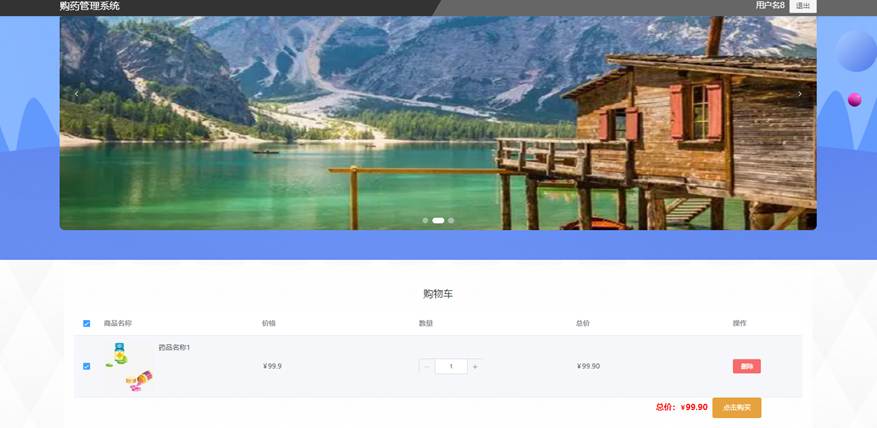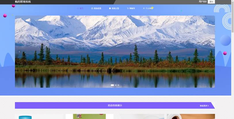 当用户打开系统的网址后,首先看到的就是首页界面。在这里,用户能够看到购药管理系统的导航条(首页、药品信息、系统公告、购物车、个人中心)和药品信息展示等。系统首页界面如图5-2所示: