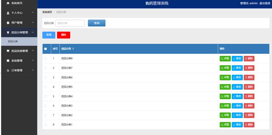 管理员点击药品分类管理,进入药品分类页面,可以通过输入药品分类进行查询的操作,还可以对药品分类信息进行新增、修改或删除等操作。具体操作页面如图5-10所示: