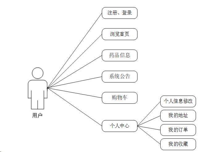 (1)、用户关键功能包含用户注册登录,查看药品信息、系统公告、购物车、个人中心等有关信息,并进行详细操作。用户用例如下: