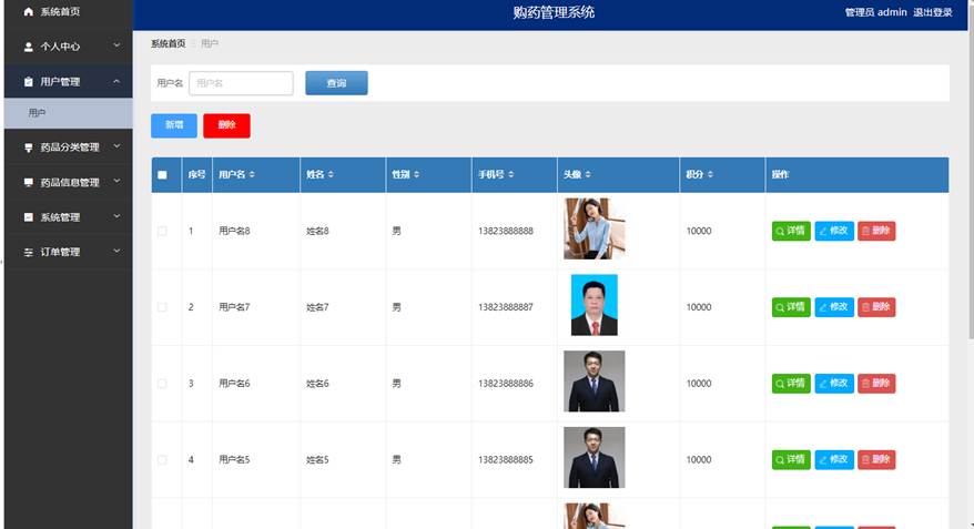 管理员点击用户管理,进入用户管理页面,可以通过输入用户名进行查询的操作,还能对用户信息进行新增、修改或删除等操作。具体操作页面如图5-9所示: