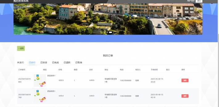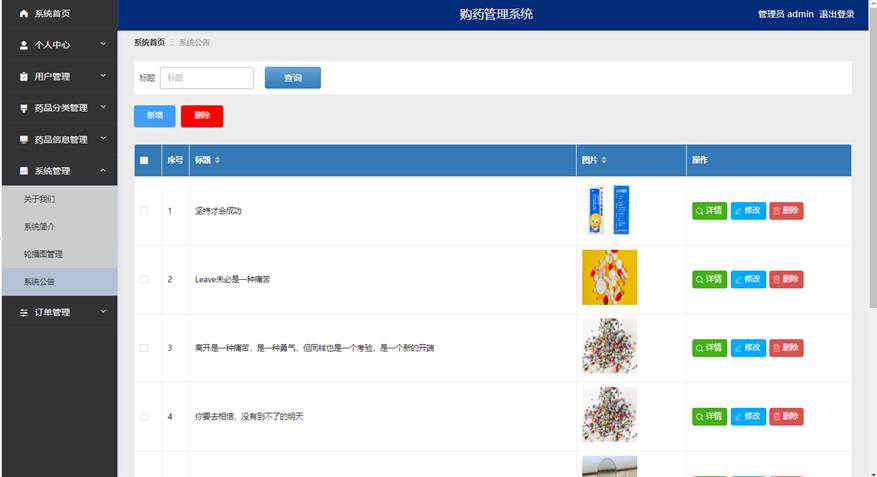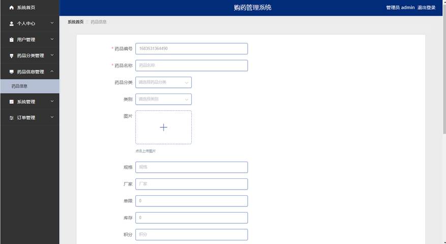 系统涵盖管理员、用户两大角色功能,核心模块包括系统首页、个人中心、用户管理、药品分类管理、药品信息管理、系统管理、订单管理等。管理员统筹平台管理;用户可查询药品信息、加入购物车、下单支付、查看订单。系统支持药品信息检索、订单跟踪、积分兑换等功能,实现了购药全流程的数字化与规范化。