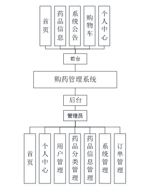 购药管理系统按照权限的类型进行划分,分为用户和管理员两个模块。用户模块主要实现个人信息修改、对药品信息、系统公告、客服中心、购物车等信息进行操作,增强了用户的操作体验。管理员模块主要针对整个系统的管理进行设计,提高了管理的效率和标准。系统的总体模块设计如下图所示: