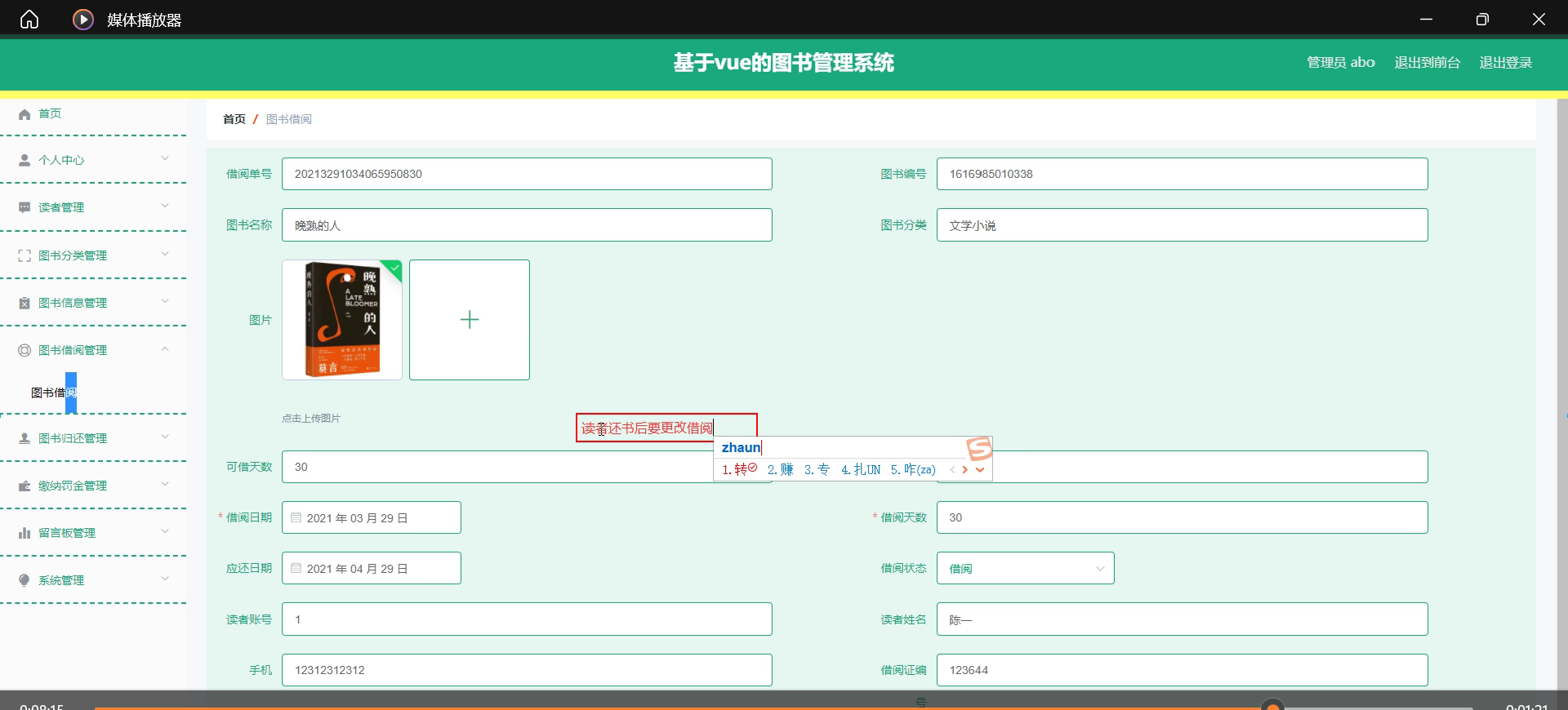 图书归还管理模块:读者归还图书时,系统更新图书状态并计算是否超期,若超期则生成罚金记录。