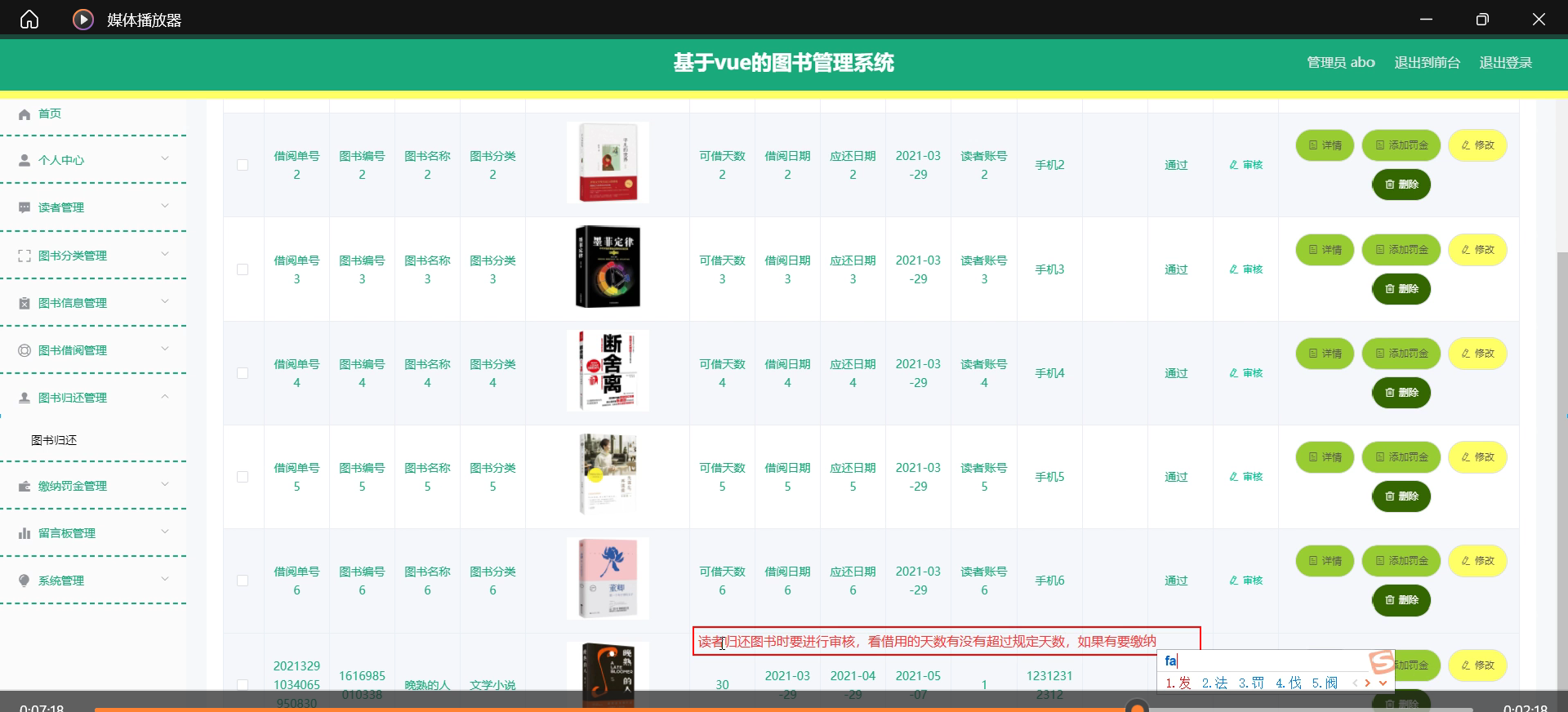 缴纳罚金管理模块:对逾期未还图书的读者进行罚金计算与缴纳管理,支持罚金记录查询与统计。