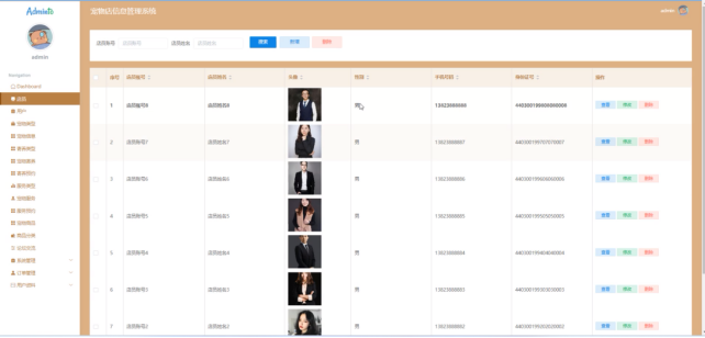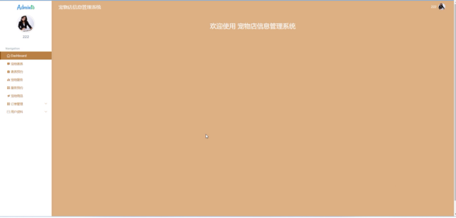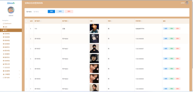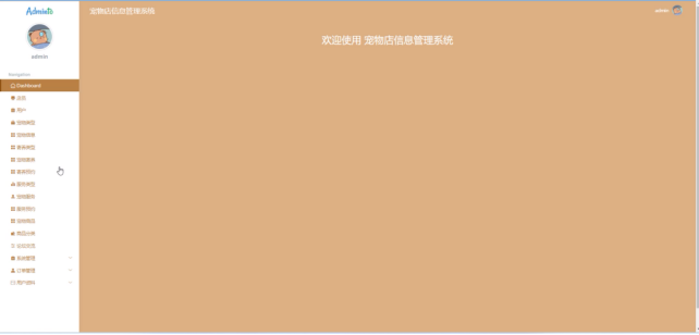 管理员进入主页面,主要功能包括对店员、用户、宠物类型、宠物信息、寄养类型、宠物寄养、寄养预约、服务类型、宠物服务、服务预约、宠物商品、商品分类、论坛交流、系统管理、订单管理、用户资料等进行操作。管理员主页面如图5-7所示: