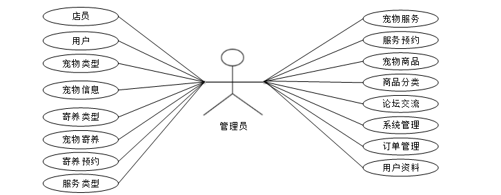 (1)管理员关键功能包含店员、用户、宠物类型、宠物信息、寄养类型、宠物寄养、寄养预约、服务类型、宠物服务、服务预约、宠物商品、商品分类、论坛交流、系统管理、订单管理、用户资料等进行管理。管理员用例如下: