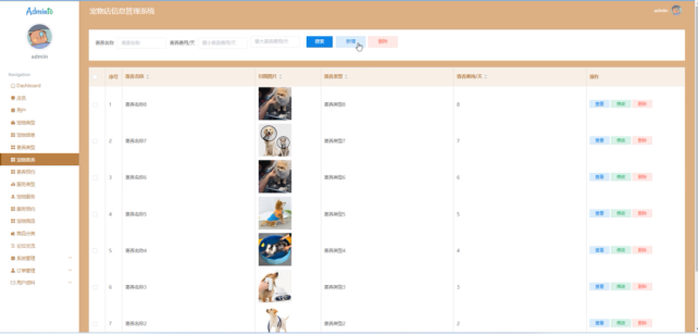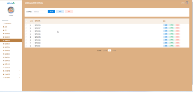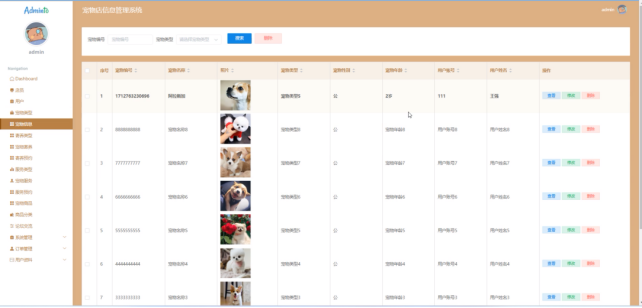 管理员点击宠物信息。在宠物信息页面输入宠物编号或宠物类型进行搜索或删除宠物信息列表,并根据需要对宠物详细信息进行查看、修改或删除操作;如图5-11所示: