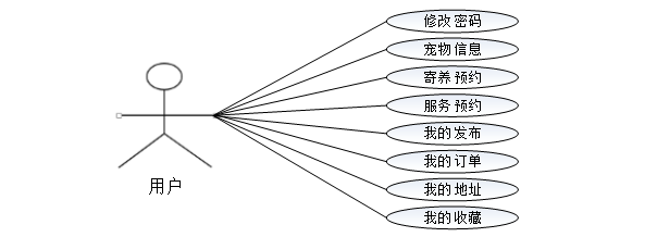 (3)用户关键功能包含修改密码、宠物信息、寄养预约、服务预约、我的发布、我的订单、我的地址、我的收藏等进行管理。用户用例如下: