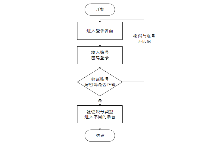 登录流程是该系统的第一个流程,登录的第一步是输入账号、密码登录,系统会验证账号与密码是否正确,正确时系统会判断账号类型再进入不同的后台;不正确时,会返回到登录的第一步,输入用户重新执行登录流程。该流程如图3-4所示。