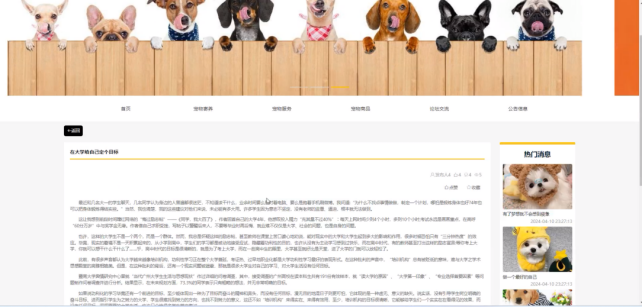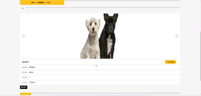 在宠物服务页面的输入栏中输入项目名称进行查询,进入宠物服务页面可以查看宠物服务详细信息,并进行收藏或服务预约等操作;宠物服务页面如图5-3所示: