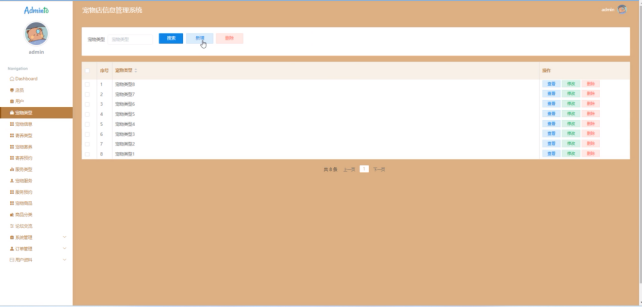 管理员点击宠物类型。在宠物类型页面输入宠物类型进行搜索、新增或删除宠物类型信息列表,并根据需要对宠物类型细信息进行查看、修改或删除操作;如图5-10所示: