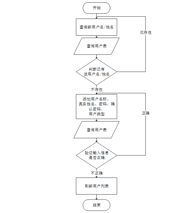 添加新用户的流程是先查询新用户名是否已存在,如已有该用户名,需重拟用户名并同时输入新用户的其它信息,添加新用户到数据库时会先验证数据是否完整,信息都正确且完整时,返回并刷新用户列表;信息不正确时,会返回输入信息的那一步。该流程如图3-5所示。