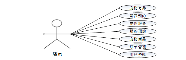 (2)店员关键功能包含宠物寄养、寄养预约、宠物服务、服务预约、宠物商品、订单管理、用户资料等进行管理。店员用例如下: