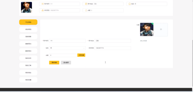 在个人中心页面输入个人信息可以进行更新操作,并在修改密码、宠物信息、寄养预约、服务预约、我的发布、我的订单、我的地址、我的收藏页面进行详细操作;如图5-5所示:
