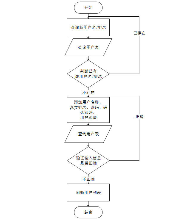 添加新用户的流程是先查询新用户名是否已存在,如已有该用户名,需重拟用户名并同时输入新用户的其它信息,添加新用户到数据库时会先验证数据是否完整,信息都正确且完整时,返回并刷新用户列表;信息不正确时,会返回输入信息的那一步。该流程如图3-5所示。