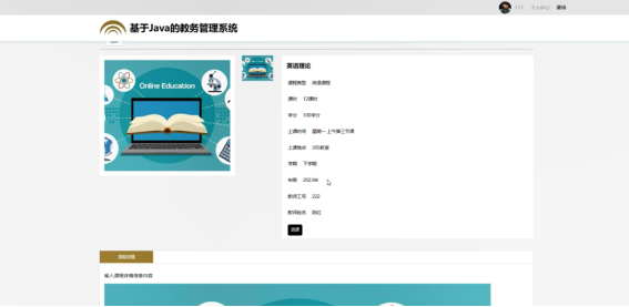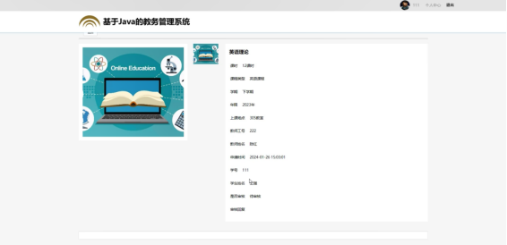 课程信息:名称、封面、类型、课时、学分、上课时间地点、学期、年限、详情、任课教师。