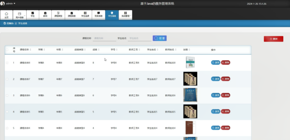 管理员可以在学生成绩界面进行学生成绩的管理,包括删查操作,可以根据课程名称、学生姓名,搜索到相应的学生成绩,并进行删查操作。该模块实现的界面如图5-15所示: