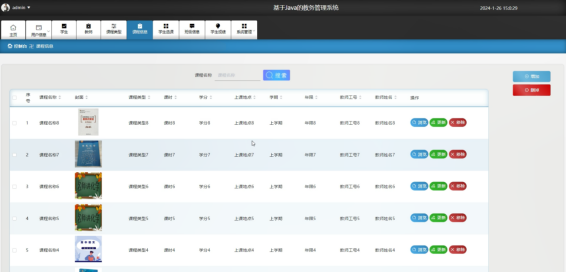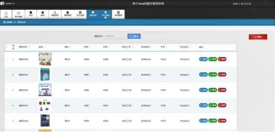 管理员可以在课程信息界面进行课程信息的管理,包括增删改查操作,可以根据课程名称,搜索到相应的课程信息,并进行增删改查操作。该模块实现的界面如图5-12所示: