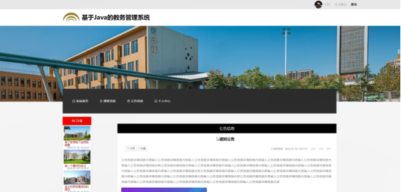 当游客打开系统的网址后,首先看到的就是首页界面。在这里,游客能够看到教务管理系统的导航条显示系统首页、课程信息、公告信息等。系统首页界面如图5-1所示: