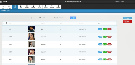学生功能在视图层(view层)进行交互,比如点击“新增”按钮或填写学生需求信息表单。这些学生信息动作被视图层捕获并作为请求发送给相应的控制器层(control1er层)。控制器接收到这些请求后,调用服务层(service层)以执行相关的业务逻辑,例如验证输入数据的有效性和与数据库的交互。服务层处理完这些逻辑后,进一步与数据访问对象层(DAO层)交互,后者负责具体的数据操作如查询、增加、更新或删除学生信息,并将操作结果返回给控制器。最终,控制器根据这些结果更新视图层,以便学生信息功能可以看到最新的信息或相应的操作反馈。在学生信息页面的输入栏中输入学号、学生姓名进行搜索,可以查看到学生详细信息,并根据需要进行增加或者删除等操作;如图5-10所示: