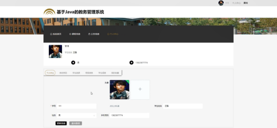 在学生成功登录教务管理系统后,通过个人中心页面,学生可以方便地管理自己的个人信息,学生也可以点击页面显示的修改密码、学生选课、班级信息、学生成绩、我的收藏进行操作。个人中心界面如图5-7所示: