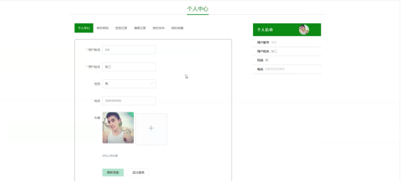 个人中心:在个人中心页面可以对个人中心,修改密码,签到记录,请假记录,我的发布,我的收藏进行详细操作;如图5-5所示: