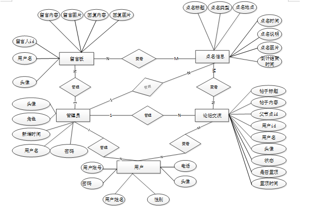 通过对多功能点名系统的主要功能信息进行规划并分为若干功能实体信息,实体信息将使用E-R图加以表示,本系统的主要功能实体图如下图所示: