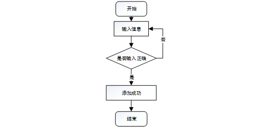 然后是添加信息的页面。进入该页面后,页面会出现一个提示框,示意操作者可以进行信息的添加,从而进行下一步的操作。用户输入想要添加的信息后提交,系统会对输入的内容进行检测。如果检测后输入的信息正确,则会出现“添加成功”的提示框,从而可以进行下一步操作;如果系统检测后检测到想要添加的信息不符合规范要求,则会提示报错,需要进行修改后重新添加。添加信息流程图如图3-4所示: