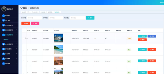 管理员点击请假记录管理。进入请假记录页面输入点名标题、点名类型或选择是否通过可以查询、删除或审核请假记录列表,并根据需要对请假记录进行查看、修改或删除操作。如图5-11所示:
