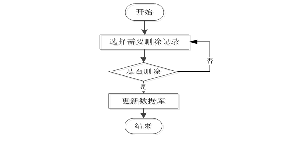 最后为删除信息页面。进入该页面后,用户可以对所要删除的信息进行选择,选择好删除的内容后,会有一个“是否确认删除”的提示框,操作者可以根据自己的意愿来选择“是”或“否”。完成上述操作,系统会自动的对删除的内容进行判断,如果符合删除要求则会成功删除数据记录,并且更新数据库的内容信息;如果删除的数据记录不符合要求,则会有一个“删除失败”的提示框,操作人员需要根据提示来进行修改,修改完成后重新删除知道删除成功。删除信息流程图如图3-5所示: