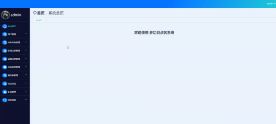 管理员进入主页面,主要功能包括对用户管理,点名信息管理,签到记录管理,请假记录管理,点名类型管理,留言板管理,论坛交流,系统管理,我的信息等进行操作。管理员主界面如图5-7所示:
