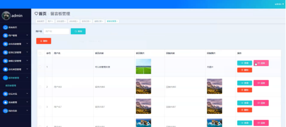 管理员点击留言板管理。进入留言板页面输入用户名可以查询或删除留言板列表,并根据需要对留言板进行查看、回复或删除操作。如图5-13所示:
