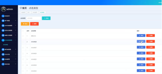 管理员点击点名类型管理。进入点名类型页面输入点名类型可以查询、添加或删除点名类型列表,并根据需要对点名类型管理进行修改或删除操作。如图5-12所示: