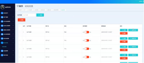 管理员点击论坛交流。进入论坛交流页面输入帖子标题可以查询或删除论坛交流列表,并根据需要对论坛交流进行查看、查看评论或删除操作。如图5-14所示: