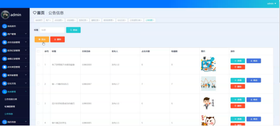 管理员点击系统管理。进入公告信息页面输入标题可以查询、添加或删除公告信息列表,并根据需要对公告信息进行查看、修改或删除操作。还可以对轮播图管理和公告信息分类进行同样的操作管理。如图5-15所示: