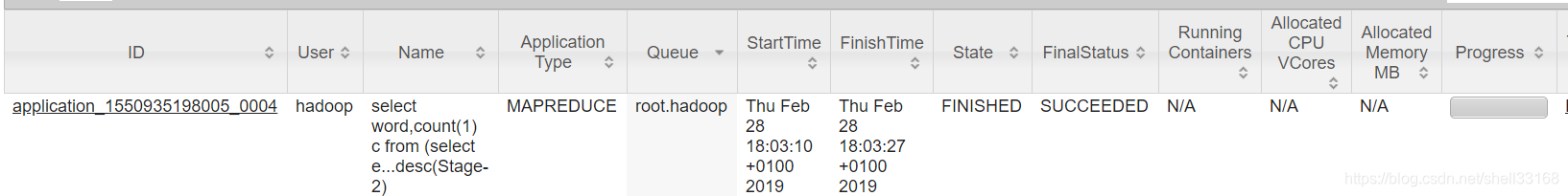 Starting Job = job_1550935198005_0003, Tracking URL = http://10-9-61-124:18088/proxy/application_1550935198005_0003/
