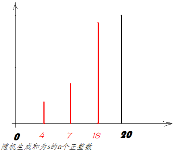 以生成和为20的4个数为例,可以先生成随机生成0到20之间的三个数字再排序,假设得到了4,7,18。然后在X-Y数轴上画出这三个数,如下图: