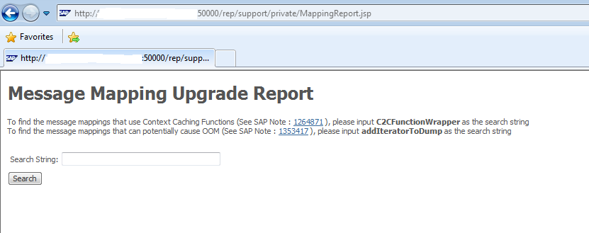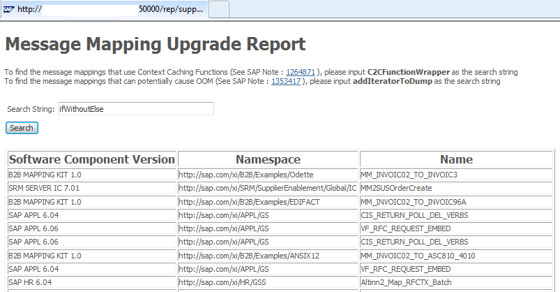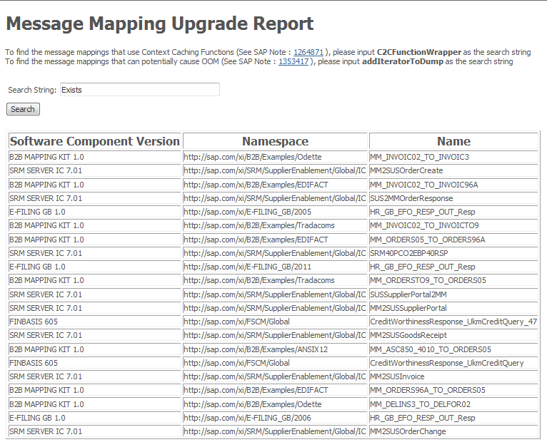 此功能由 SAP 提供,用于查找使用上下文缓存函数的映射(请参阅 SAP Note 1264871 Ifs,Ifs,Without else)和可能导致 OutOfMemoryErrors 的映射 (请参阅 SAP Note 1353417 Message mapping Runtime 中的 OutOfMemory 异常)。但是,此功能可以 还用于搜索使用任何标准函数的 PI 映射。