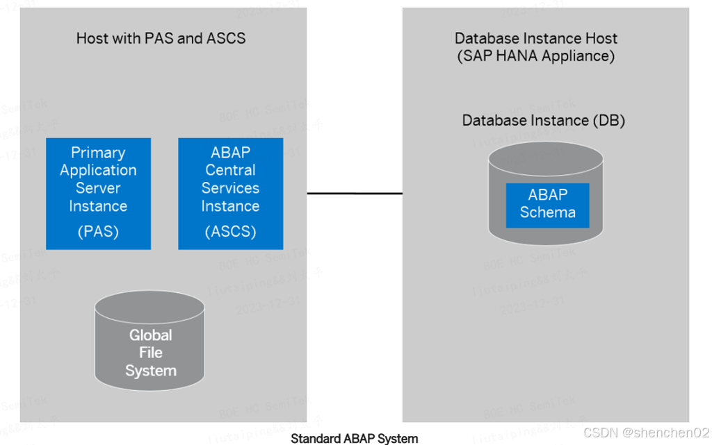 在标准系统部署环境中,当主应用服务器(PAS)宕机,整个SAP系统会变得不可用,应用服 务器推荐采用虚拟化模式以提供高可用,数据库服务器实例可以通过系统复制机制提供高可用、灾 难恢复。