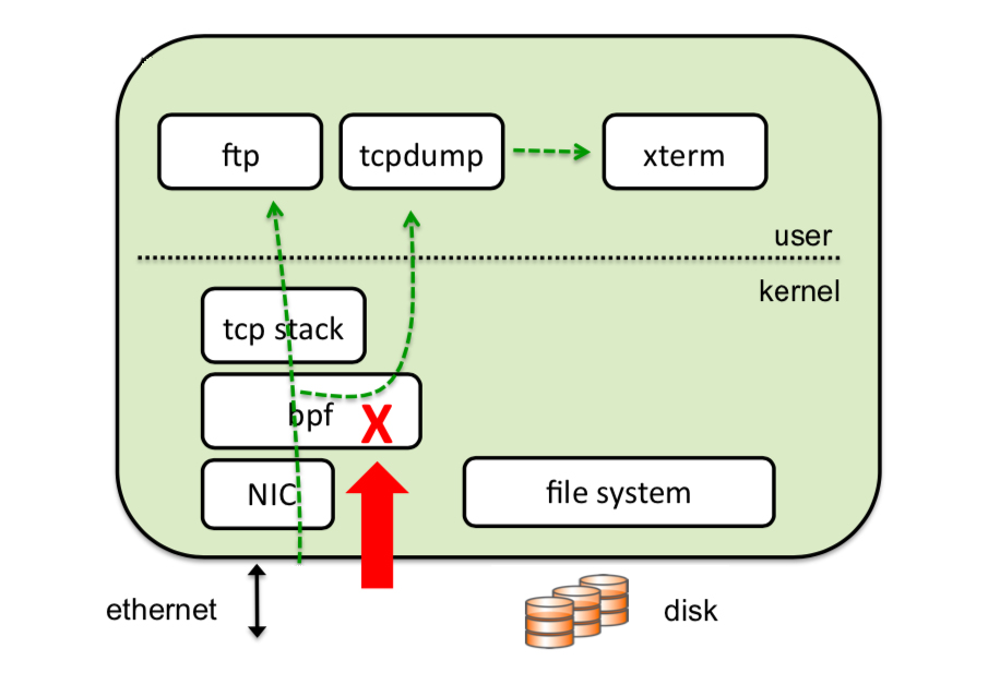 数据包过滤器(BPF)主要作用,就是根据用户输入的过滤规则,只将用户关心的数据包拷贝至 tcpdump,这样能够减少不必要的数据包拷贝,降低抓包带来的性能损耗。