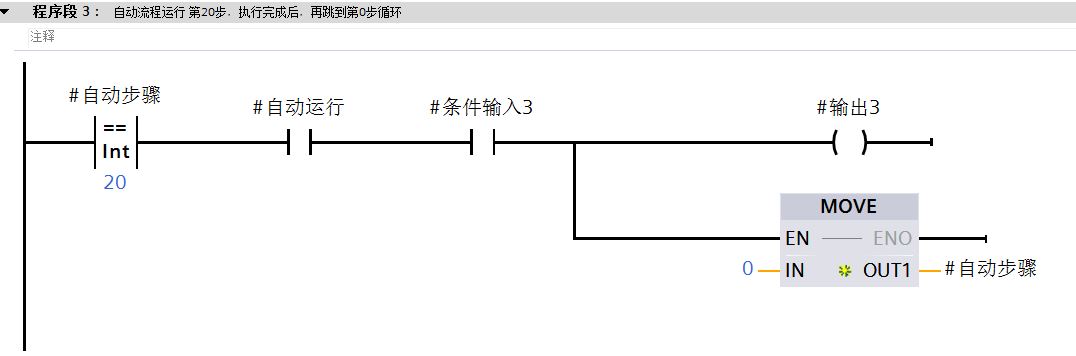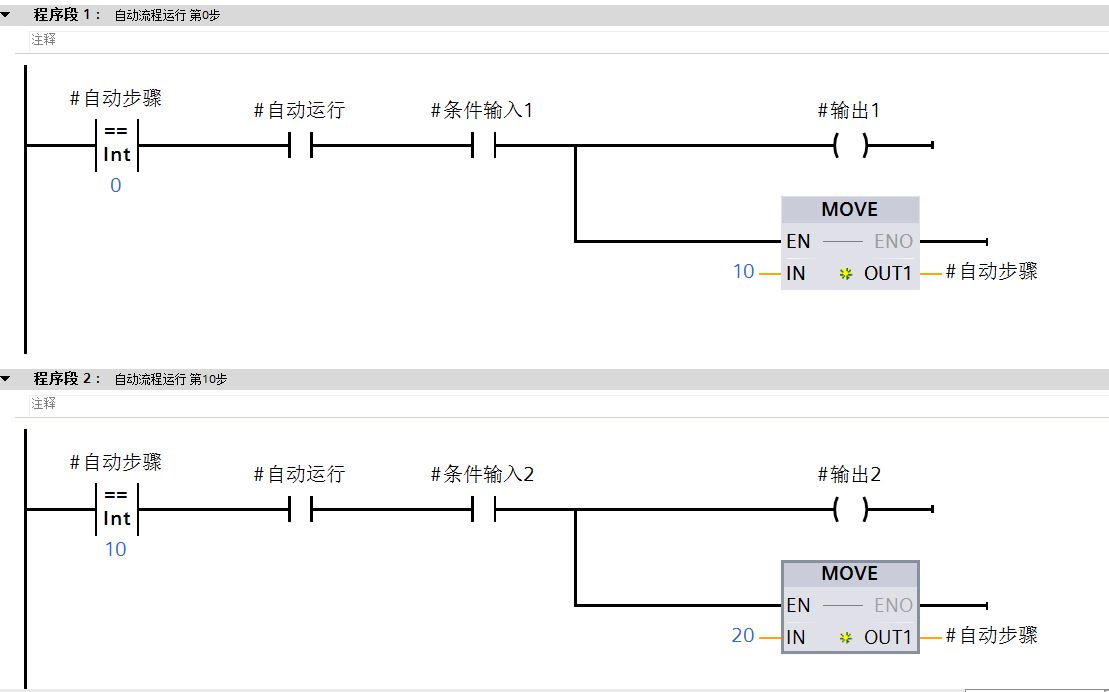 LAD梯形图是最常用的一种方式,利用比较指令,判断当前步骤,步骤程序执行完成后,再用MOVE指令进行赋值,跳转到下一步