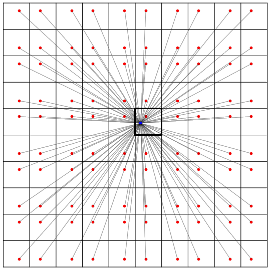 解决这类问题的一个常用技巧便是利用多次翻折把反射路线变为直线。现在,把这个房间不断地翻折,让它平铺整个平面;各种复杂的反射路径,就变成了一条一条的直线段。这样,我们便可认为恶魔的激光并不是在反射,而是径直穿过镜面射入房间的“虚像”。恶魔的目标,便是直接对准某个天使的虚像射击。由于天使的虚像只有可数个,因此天使可以在恶魔周围摆放可数个守卫,一一挡住射向每一个天使虚像的激光(有觉得下图中的网格线弯曲得异常严重吗?那是你的错觉)。