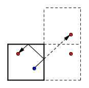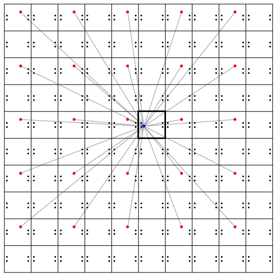 容易看出,所有天使虚像的坐标都形如 (2m ± a, 2n ± b) ,其中 m 和 n 都是整数(可能为负)。我们先来考察其中一类虚像,即所有形如 (2m - a, 2n + b) 的点。对于任意确定的 m 和 n ,恶魔 (c, d) 和天使虚像 (2m - a, 2n + b) 的连线都会经过 (m - a/2 + c/2, n + b/2 + d/2) 这个点,因为这个点其实是前两个点的连线的中点。也就是说,在每个格子里的 (- a/2 + c/2, b/2 + d/2) 处都放一个点,就能够挡住所有射向这类虚像的激光了:
